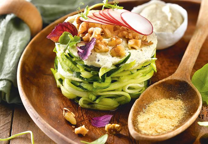 - Masajéalos suavemente con los dedos para aderezarlos bien, sin romperlos, y déjalos macerar 2 o 3 minutos para que se ablanden y suelten agua mientras preparas la salsa. En una batidora de vaso mezcla el resto de ingredientes y los restos de calabacín menos las nueces troceadas, y bátelos hasta obtener una salsa muy suave.